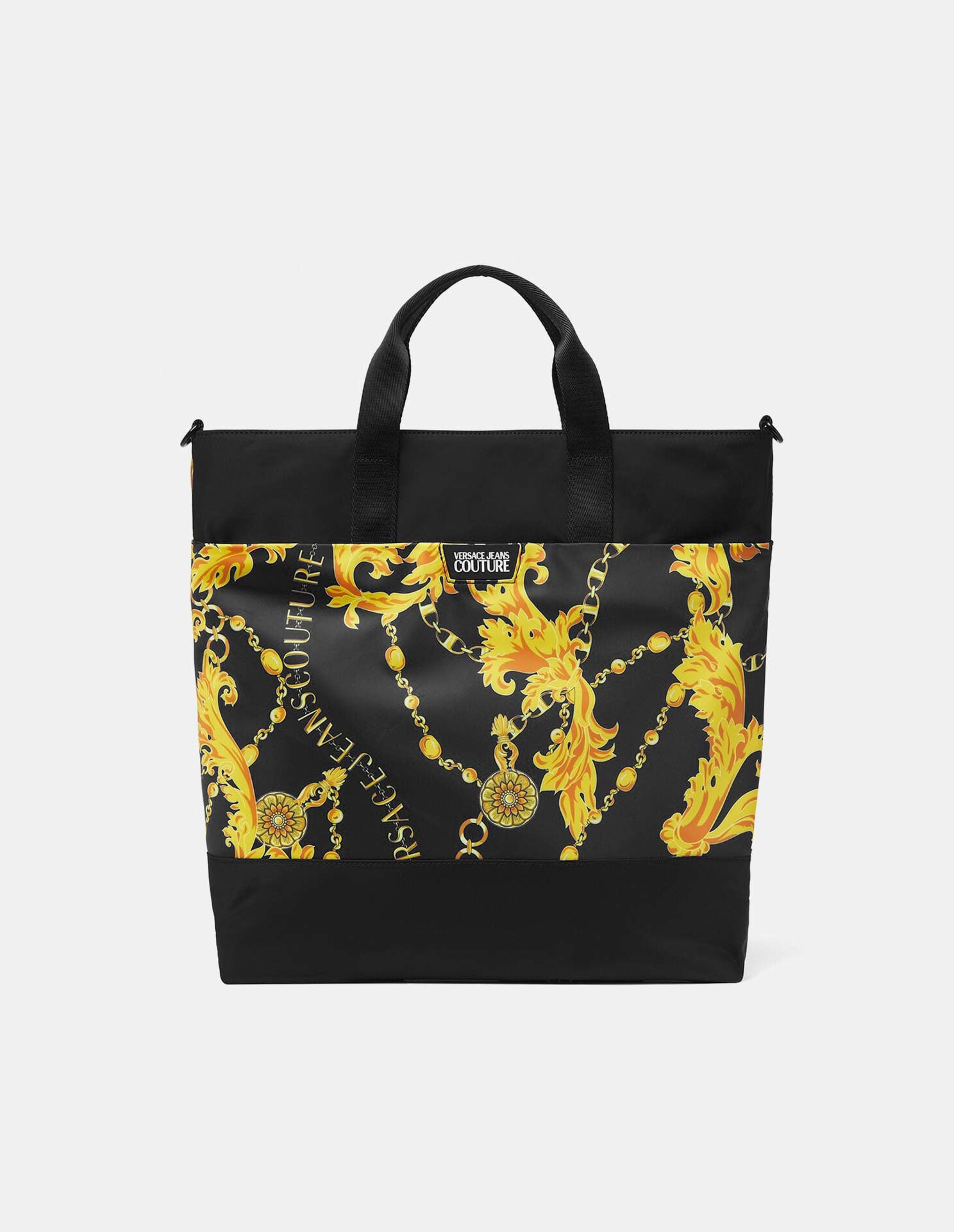 A yellow and black shopping bag features the new Versace Jeans Couture Chains pattern. This bag has multiple compartments to comfortably fit all your necessities in it.